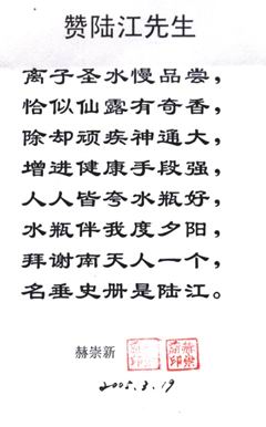凡尊重中國古代養(yǎng)生智慧的患者,堅持“已饑方食”和定時主動補水者,均可祛病康復。如牡丹江醫(yī)學院87歲的張鵬圖飲用半年后高血壓未痊愈,陸江與他通話交流,了解他原先每日主食4兩,建議他用“已饑方食”減少主食肉食量,他理解后,將每日主食減為3兩,少吃兩塊肉,飲用一年治愈26年的冠心病和高血壓。他2003年5月31日來信說:“飲用卓康小分子團水是根治高血壓、冠心病、糖尿病的一把金鑰匙,是填補醫(yī)學空白,為人類造福,應推廣該產品。”